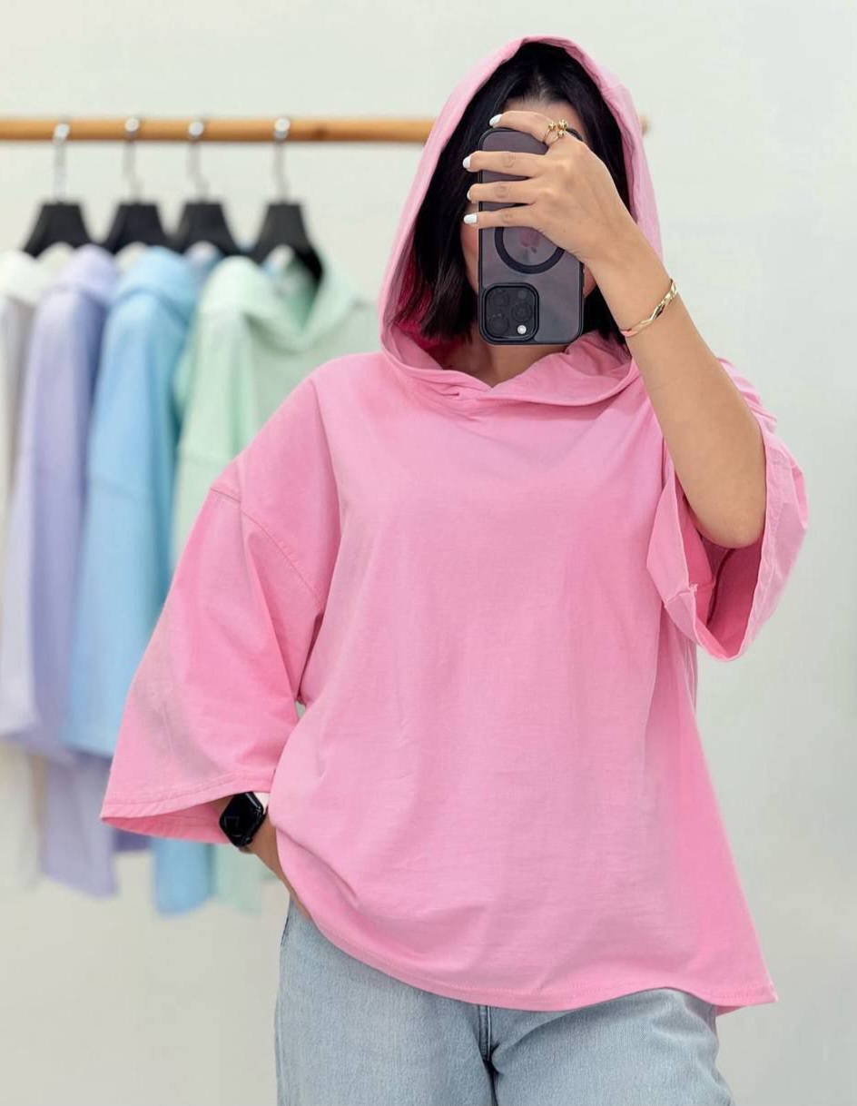 تیشرت باکسی ساده رنگی کلاهدار