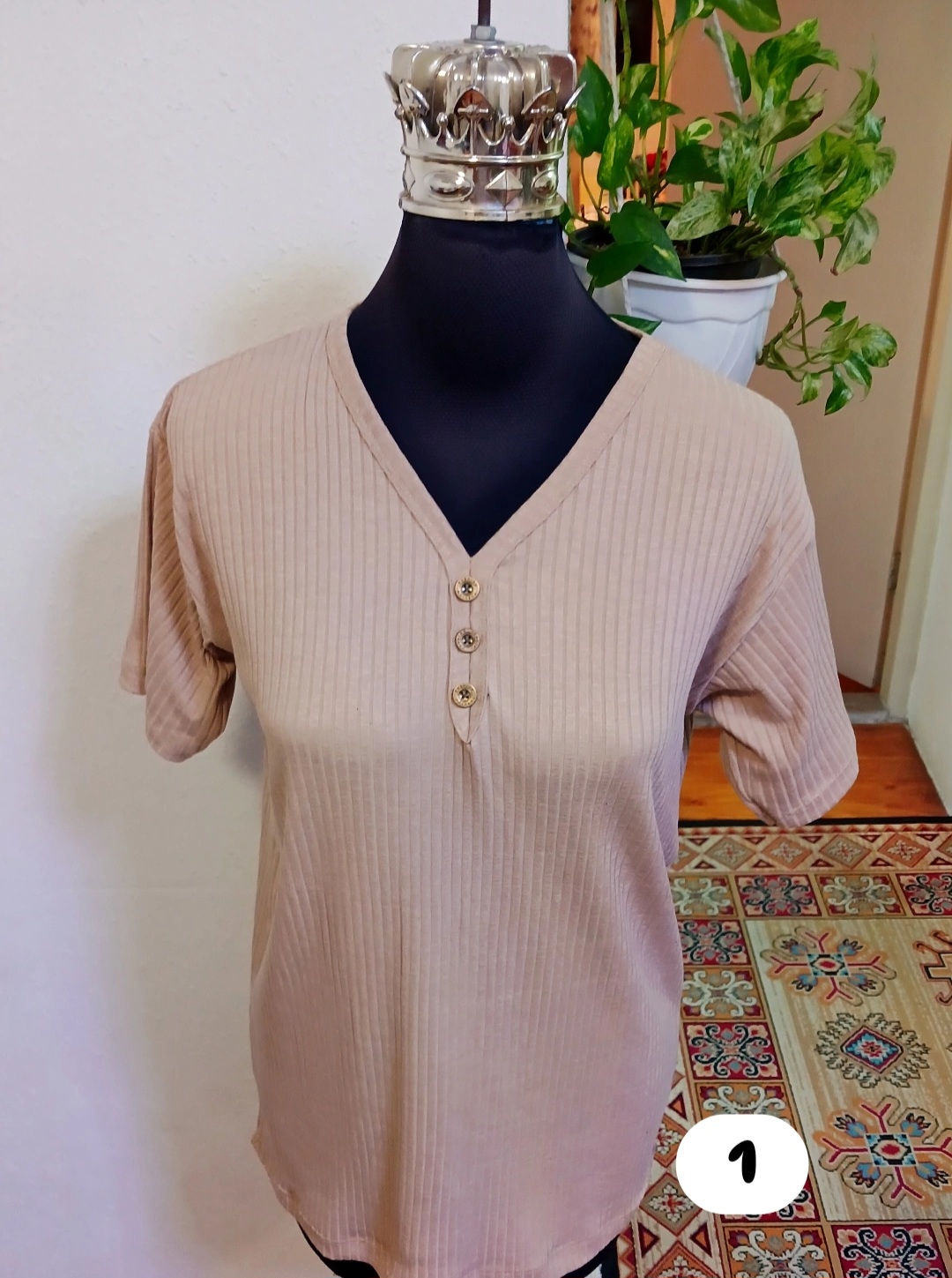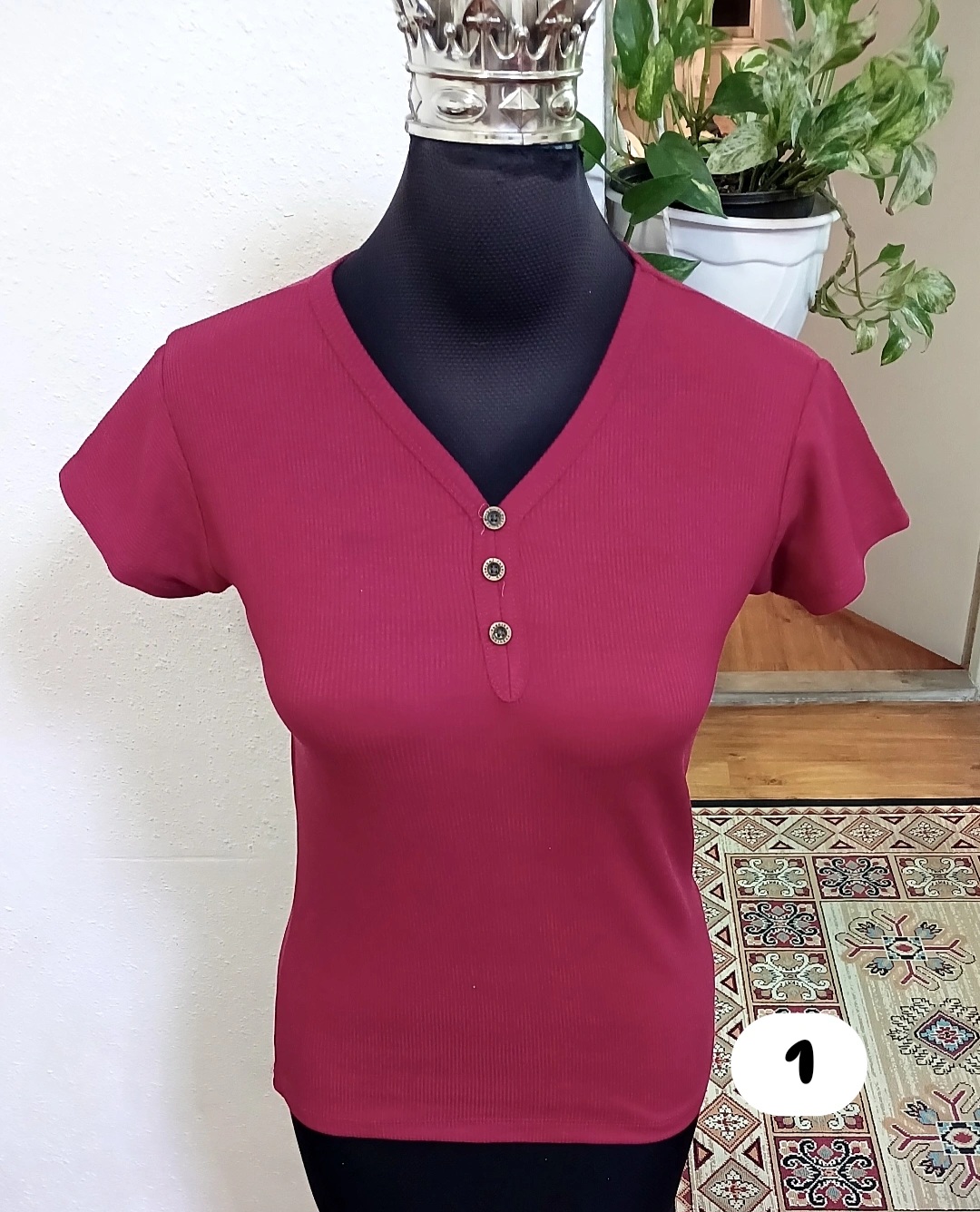 تیشرت زنانه کبریتی آستین سرخود یقه گردسه دگمه باکشسانی بالا