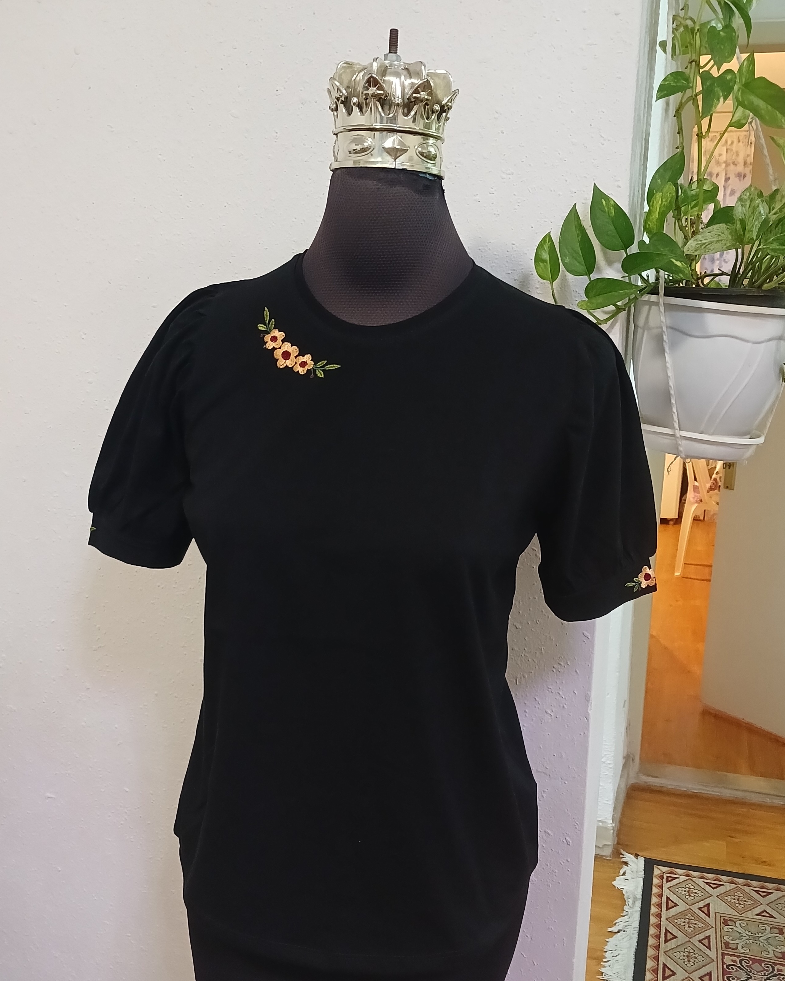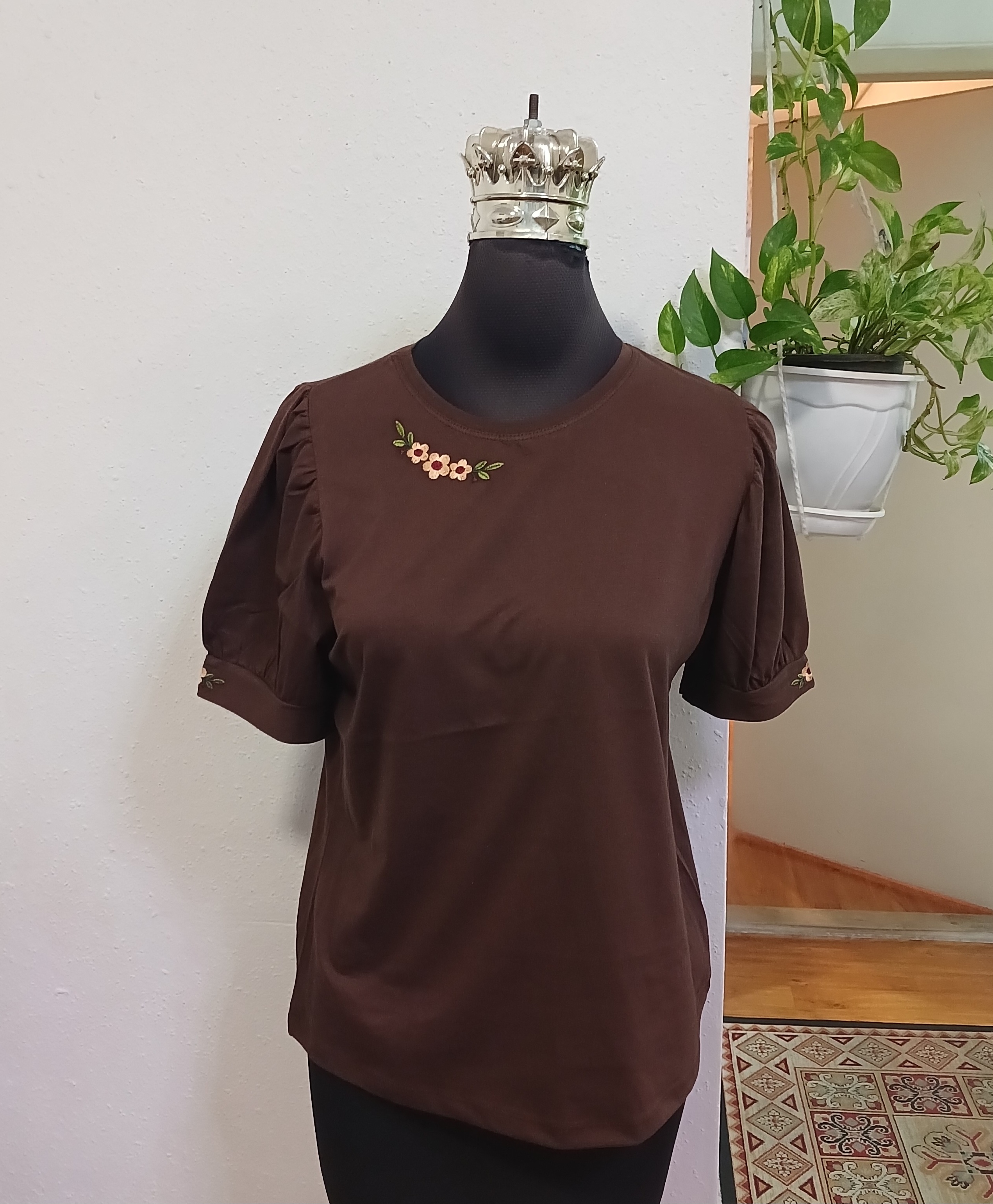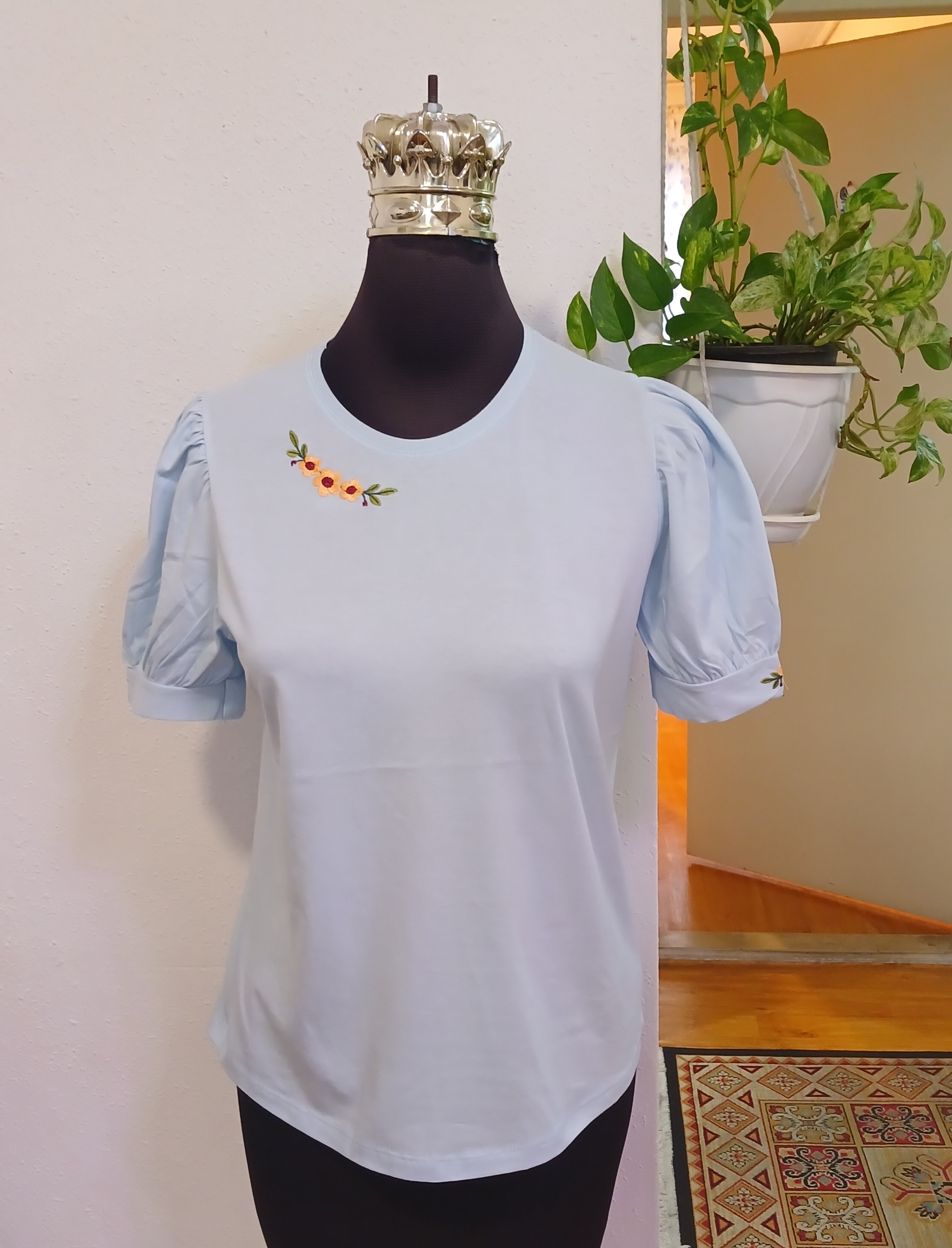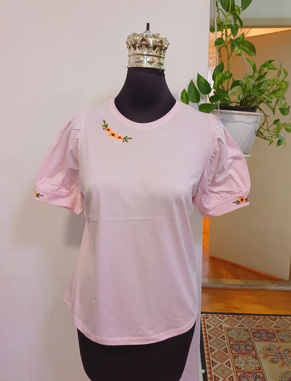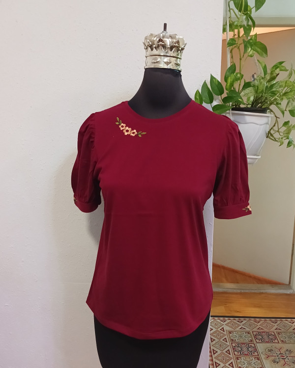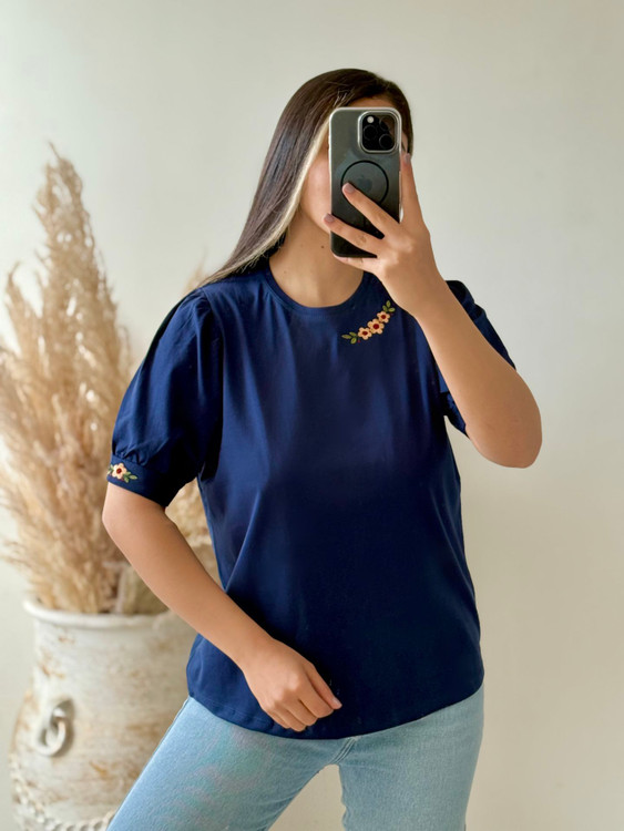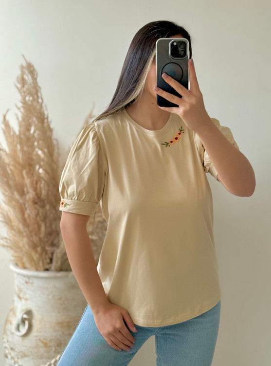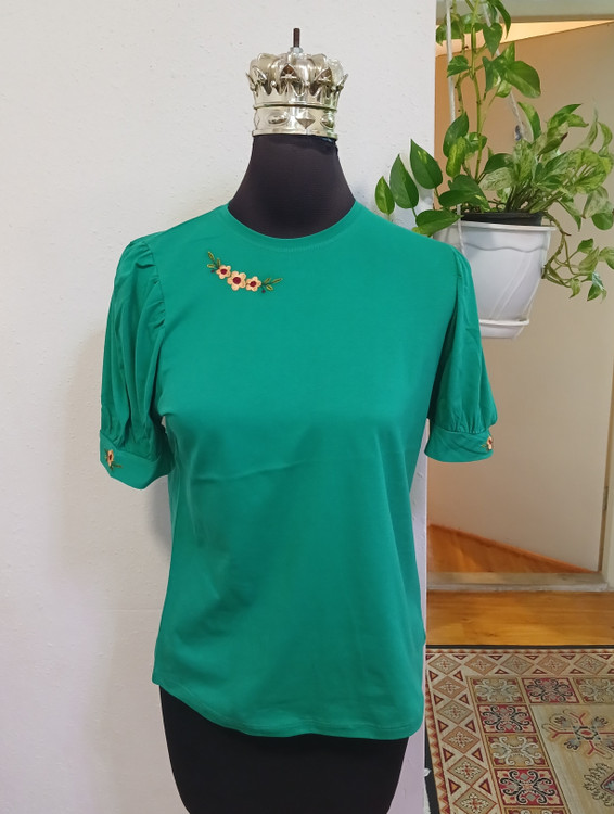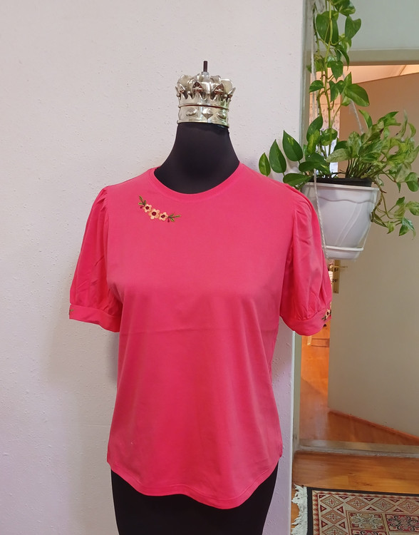 تیشرت زنانه سوپرپنبه آستین پرنسسی چین دار روی سینه وآستین گلدوزی