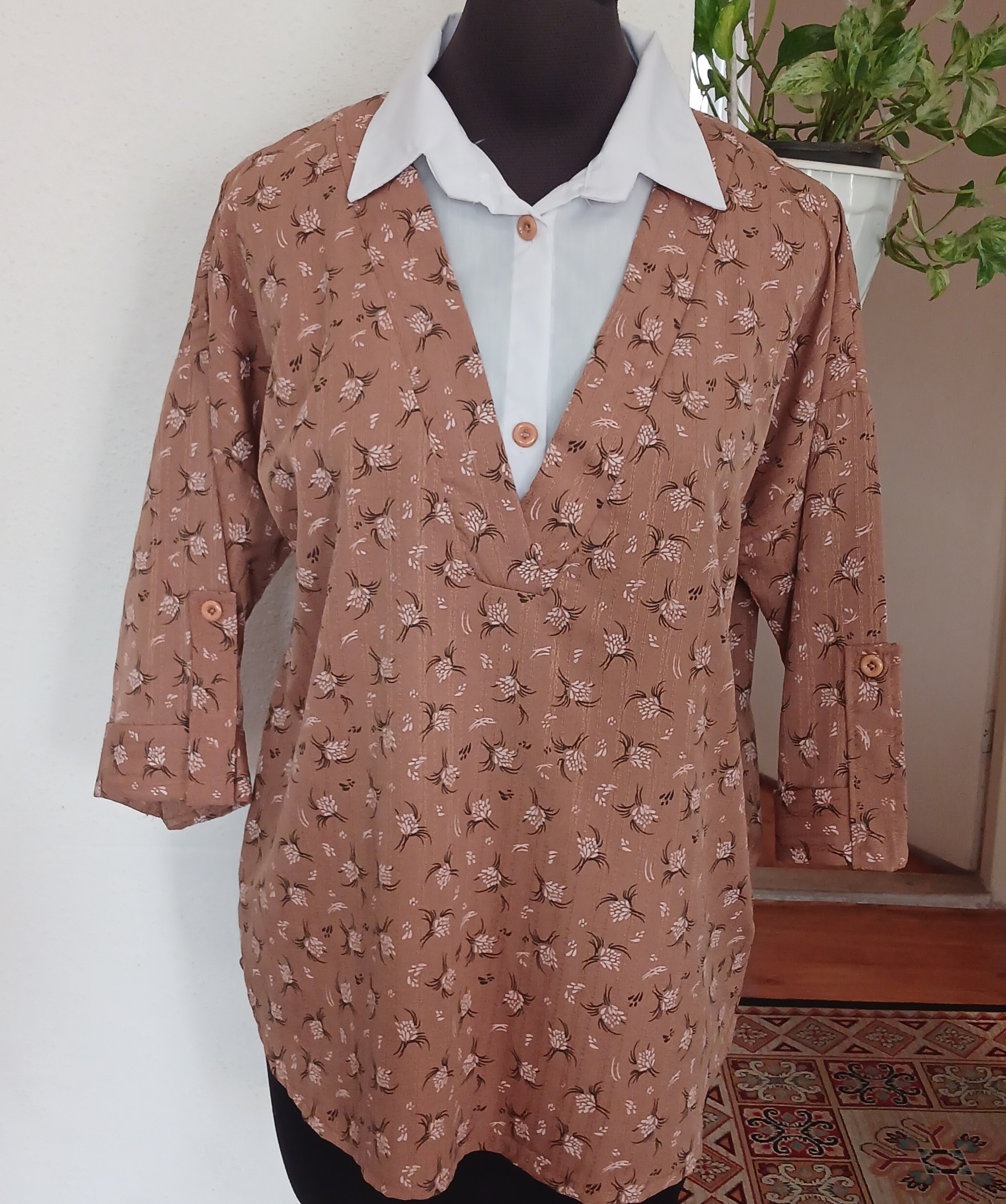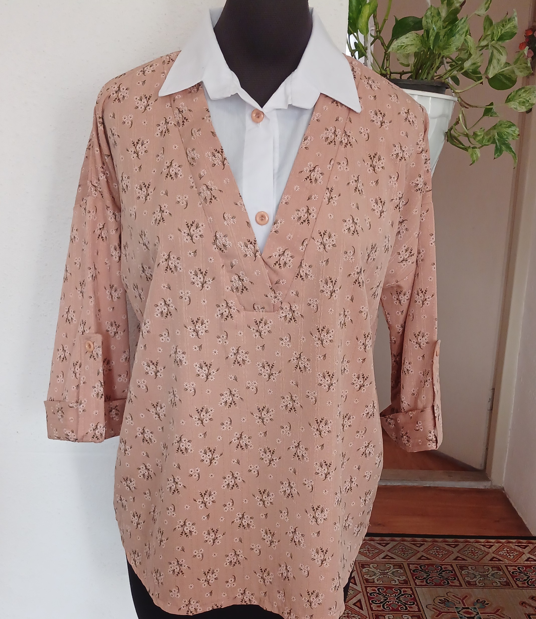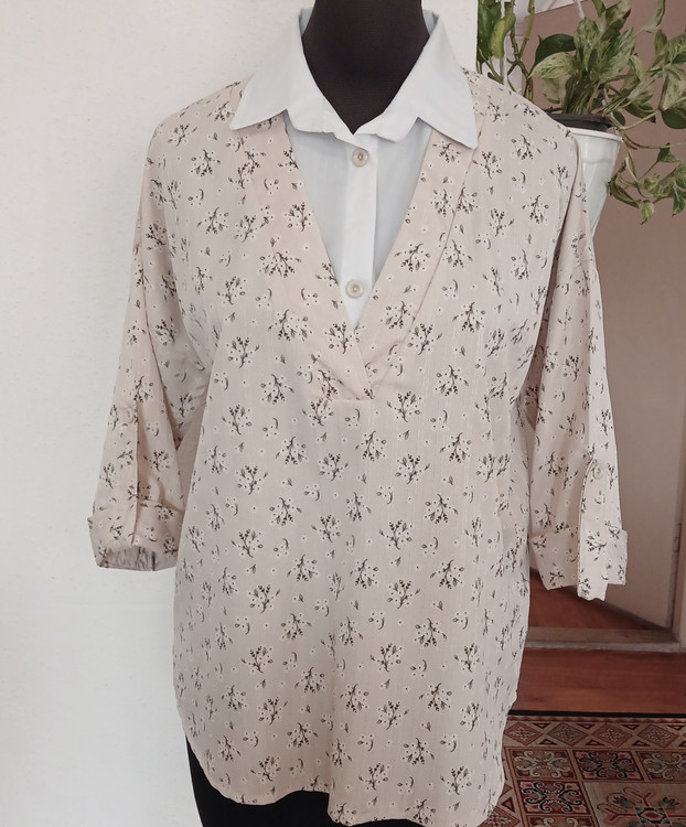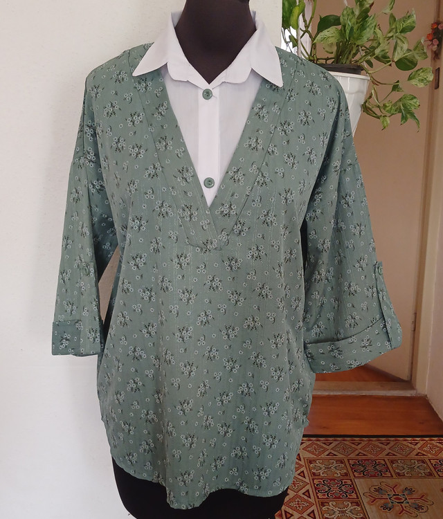 شومیز زنانه یقه سفید گل گچی آستین پاگون دار , جنسش نخی باکیفیت و با ایستایی بالا در چهار رنگ ترکیب با یقه سفید بسیار شیک و خوش استایل