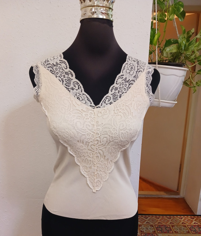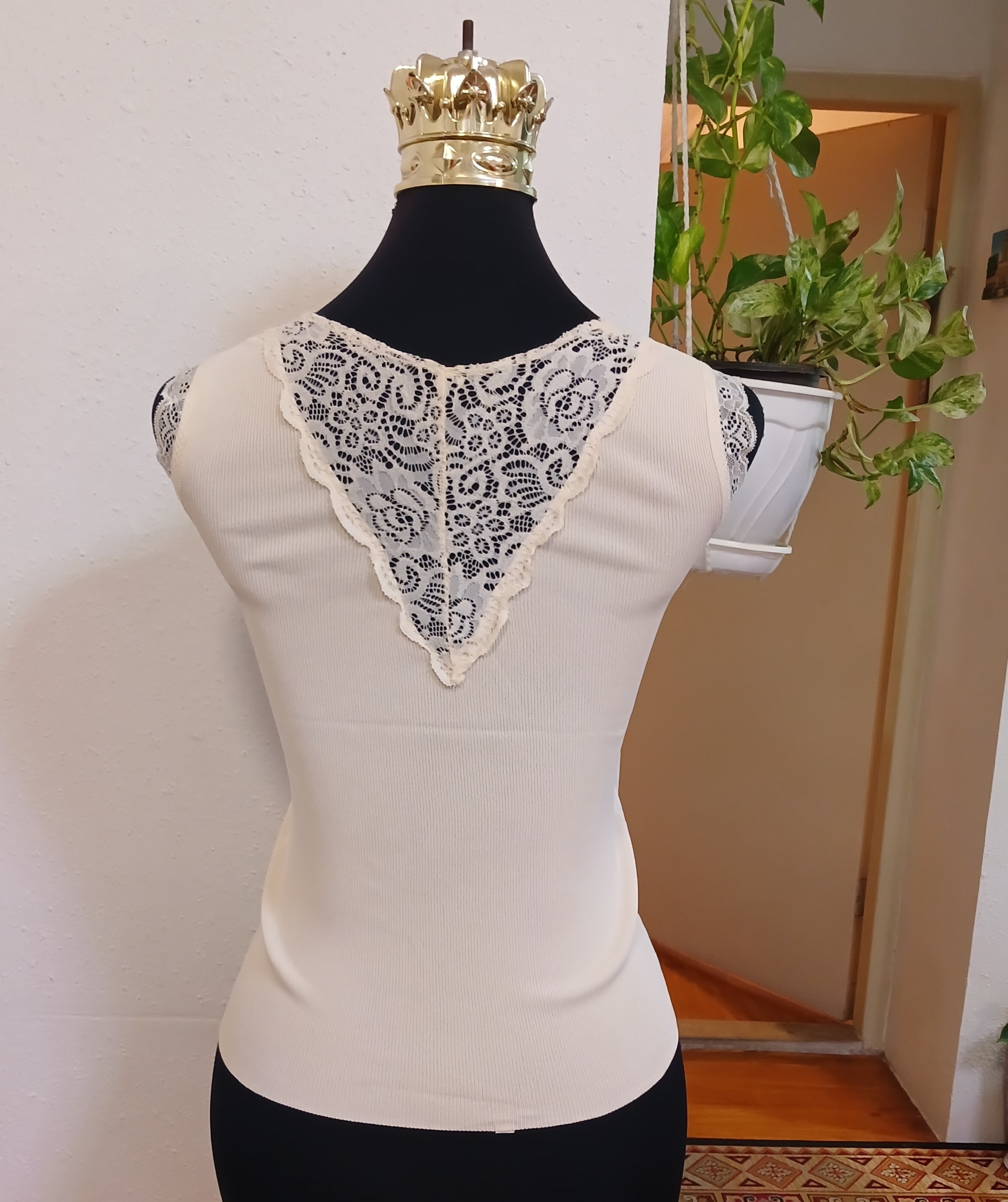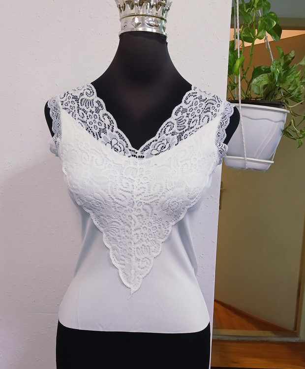 تاپ زنانه سوپربافت وارداتی گیپوردار یه تاپ وارداتی لطیف که روی سینه و پشتش گیپور داره بسیار شیک و منحصربفرده