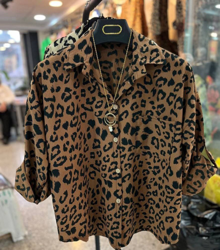 شومیز زنانه پلنگی یقه مردونه جلودگمه آستین پاگون دار